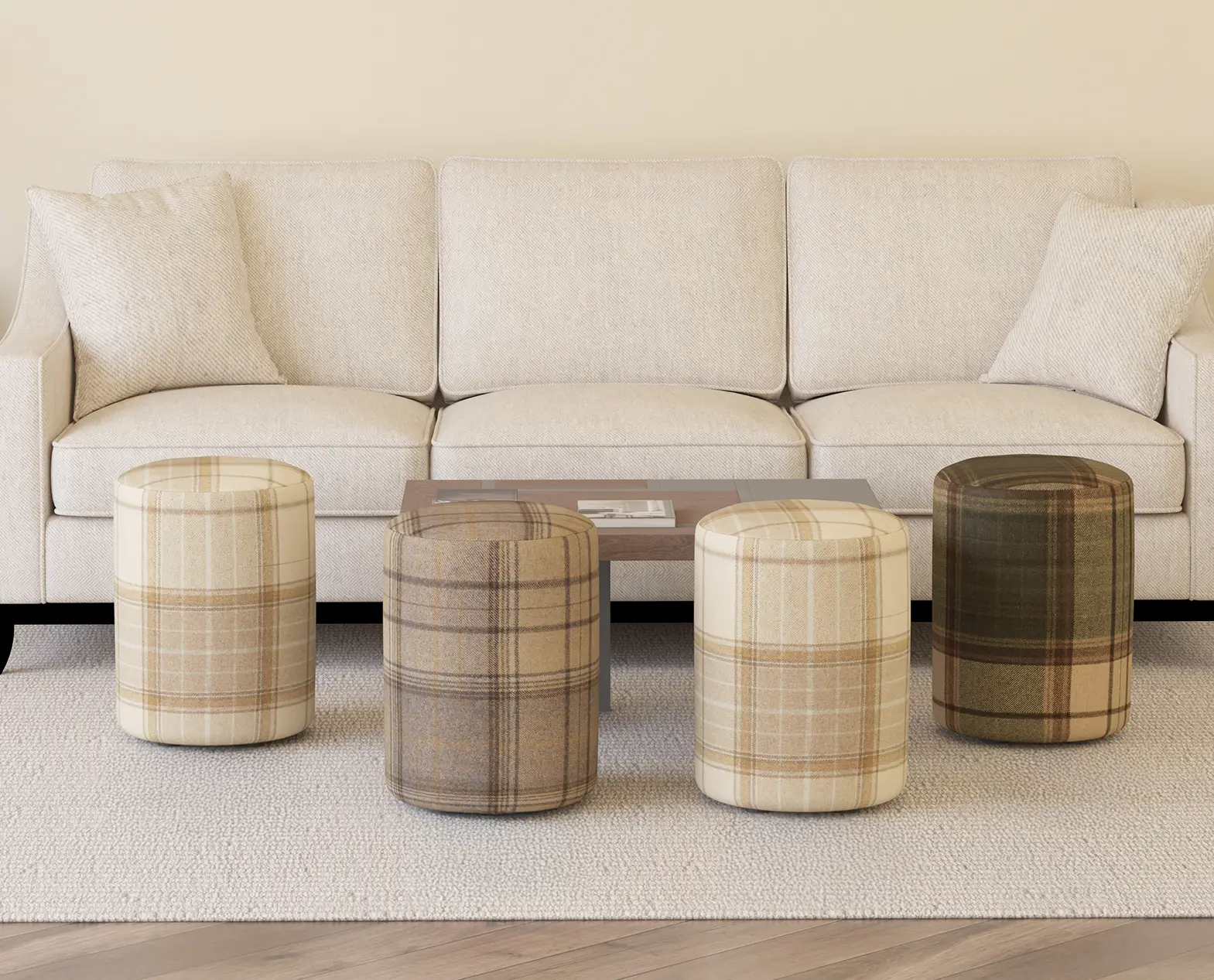Colour woven seating round stools (100% wool tartan) produced by craftsmen and women at our own Yorkshire factory.